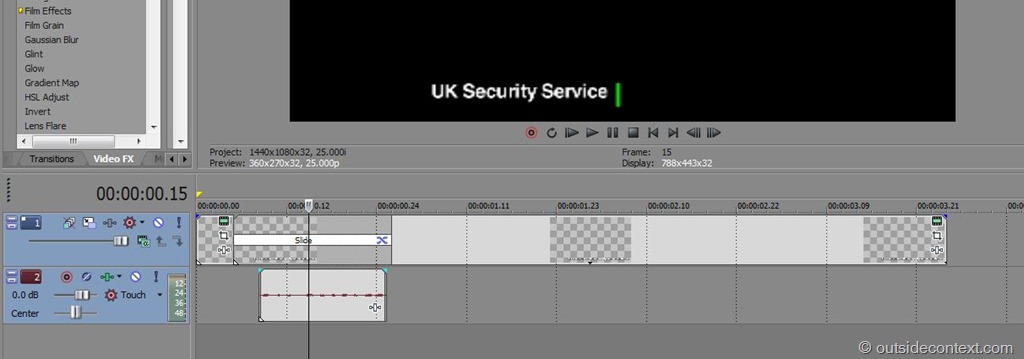 For sounds I raided Freesound.org for suitable sounds and ended up using something like 20 in places such as the tires screeching during “The Grab” scene (they did screech but my camera mike didn’t make enough of it) and “clanking” noises during “The Question” interrogation scene. I can’t recommend this site enough. Good sound effects makes a huge difference. For music I went to my friends at Audionetwork.com. They are truly fantastic, enabling the small filmmaker to use music created by seriously high-end orchestra for a mere pittance. Wonderful.